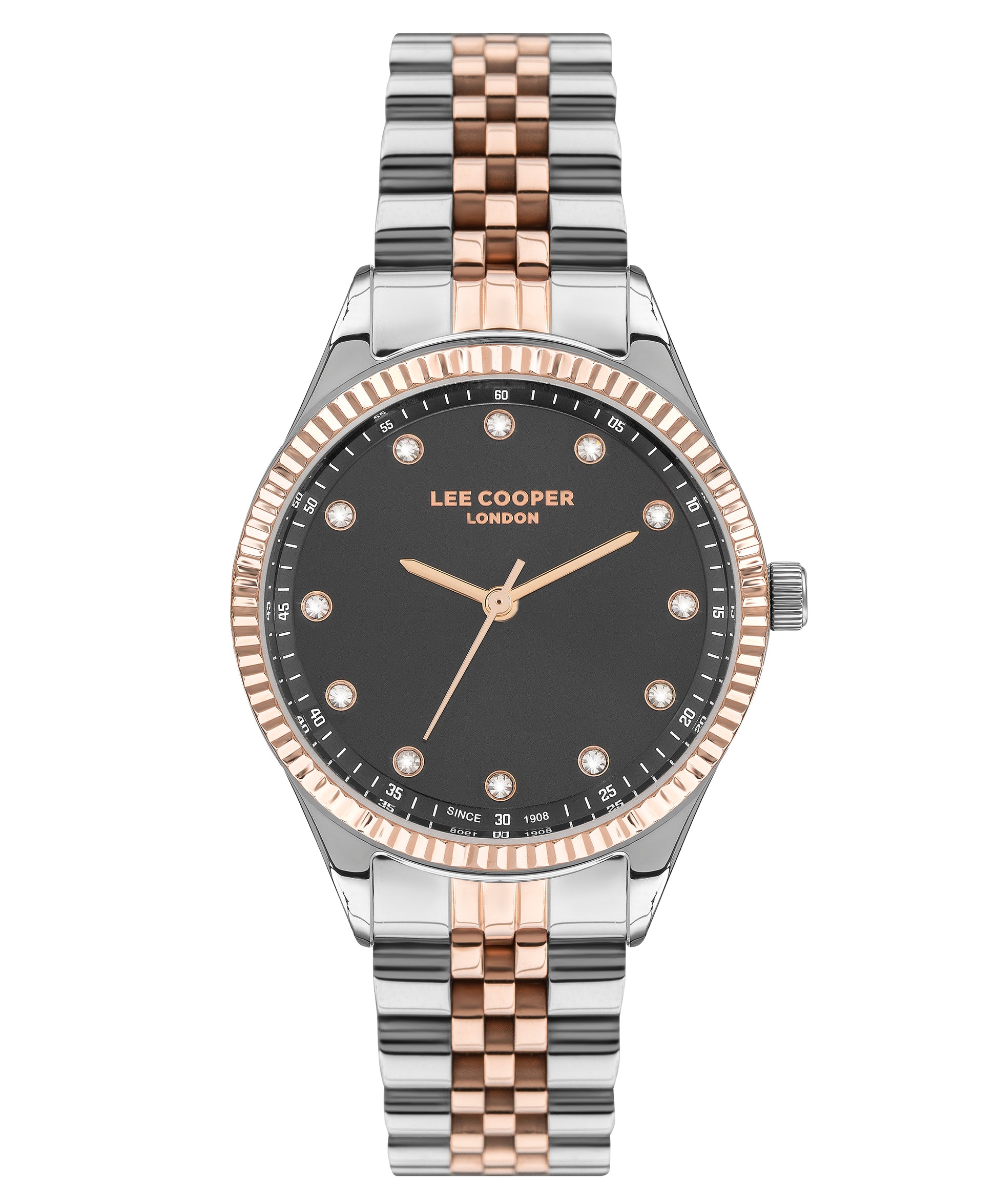 La montre Lee Cooper LC07310.550 est une montre bracelet en acier inoxydable bicolore , avec une monture en métal et un bracelet en métal, un diamètre d'horloge de 47 mm, un matériau de cadre en acier inoxydable et un type de cristal.