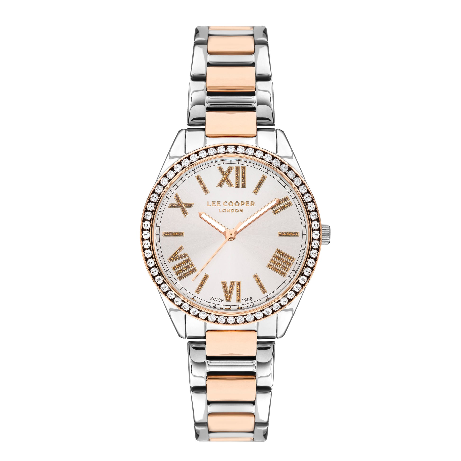 La montre Lee Cooper LC07435.530 est une montre pour femme avec un bracelet en métal argent et or rose, alimenté par des mouvements ponctuels japonais de premier plan et décoré de cristaux brillants. Le cadran multifonction blanc est doté d'aiguilles et de marqueurs lumineux de couleur or rose.