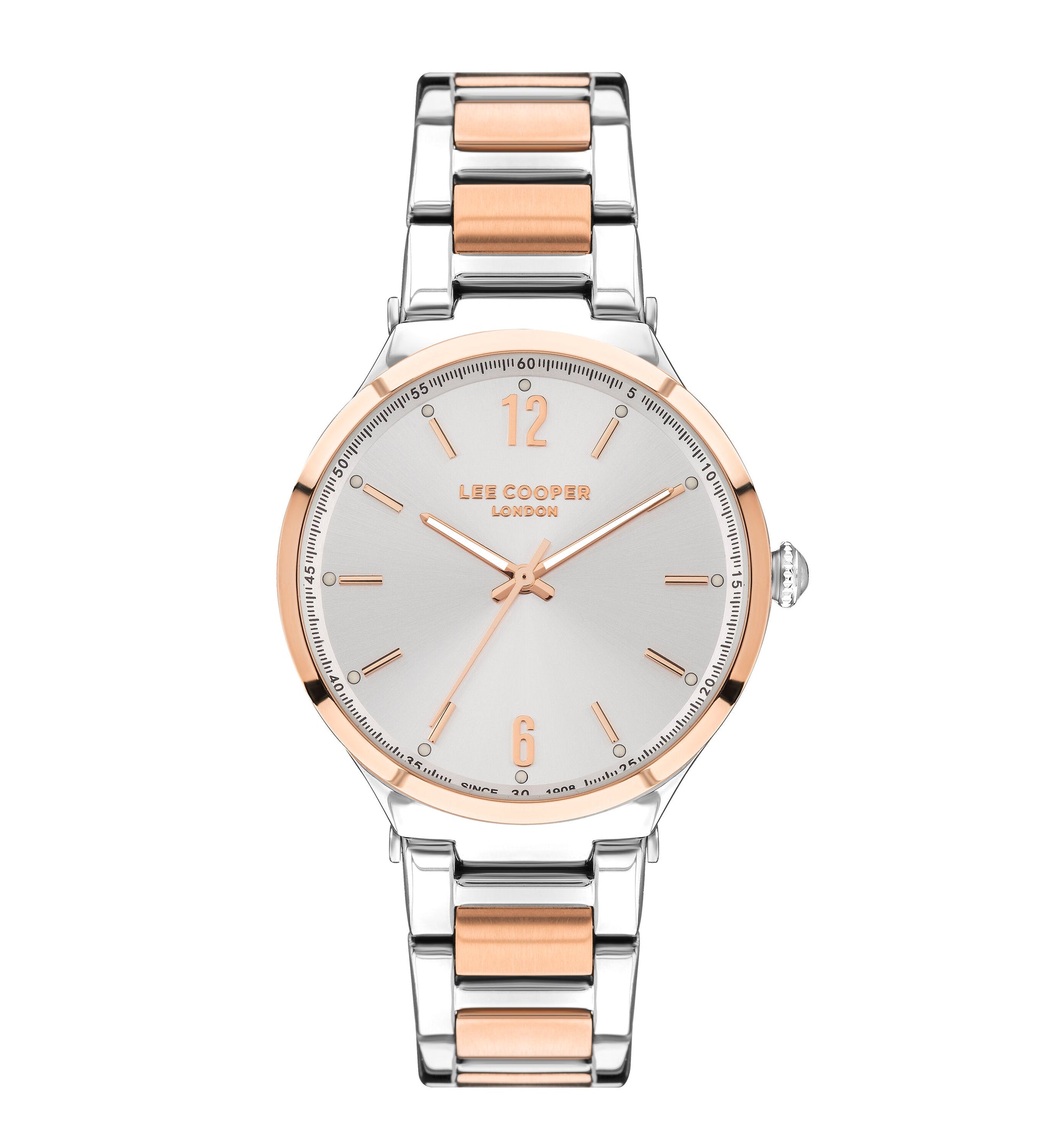La montre Lee Cooper LC07440.520 élégante avec un boîtier et un bracelet en acier inoxydable, avec un cadran blanc avec des accents d'or rose. La montre a un mouvement à quartz et est étanche jusqu'à 50 mètres, comporte également des aiguilles et des marqueurs lumineux pour une visibilité facile dans des conditions de faible luminosité.