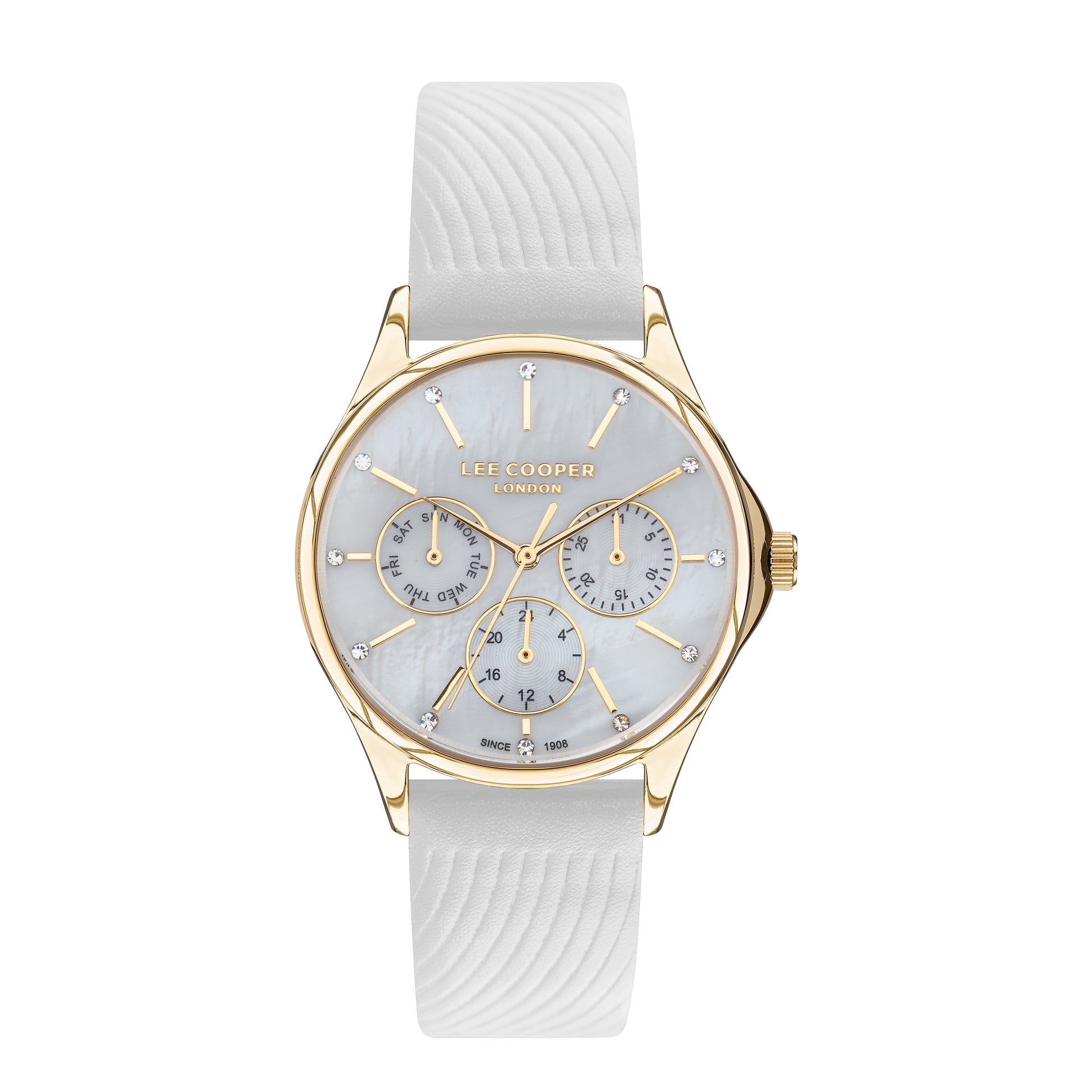 La montre Lee Cooper LC07451.122 est dotée d'un bracelet en cuir blanc, d'un boîtier argenté, d'un mouvement à quartz et d'un cadran uni à 3 aiguilles de forme ronde.