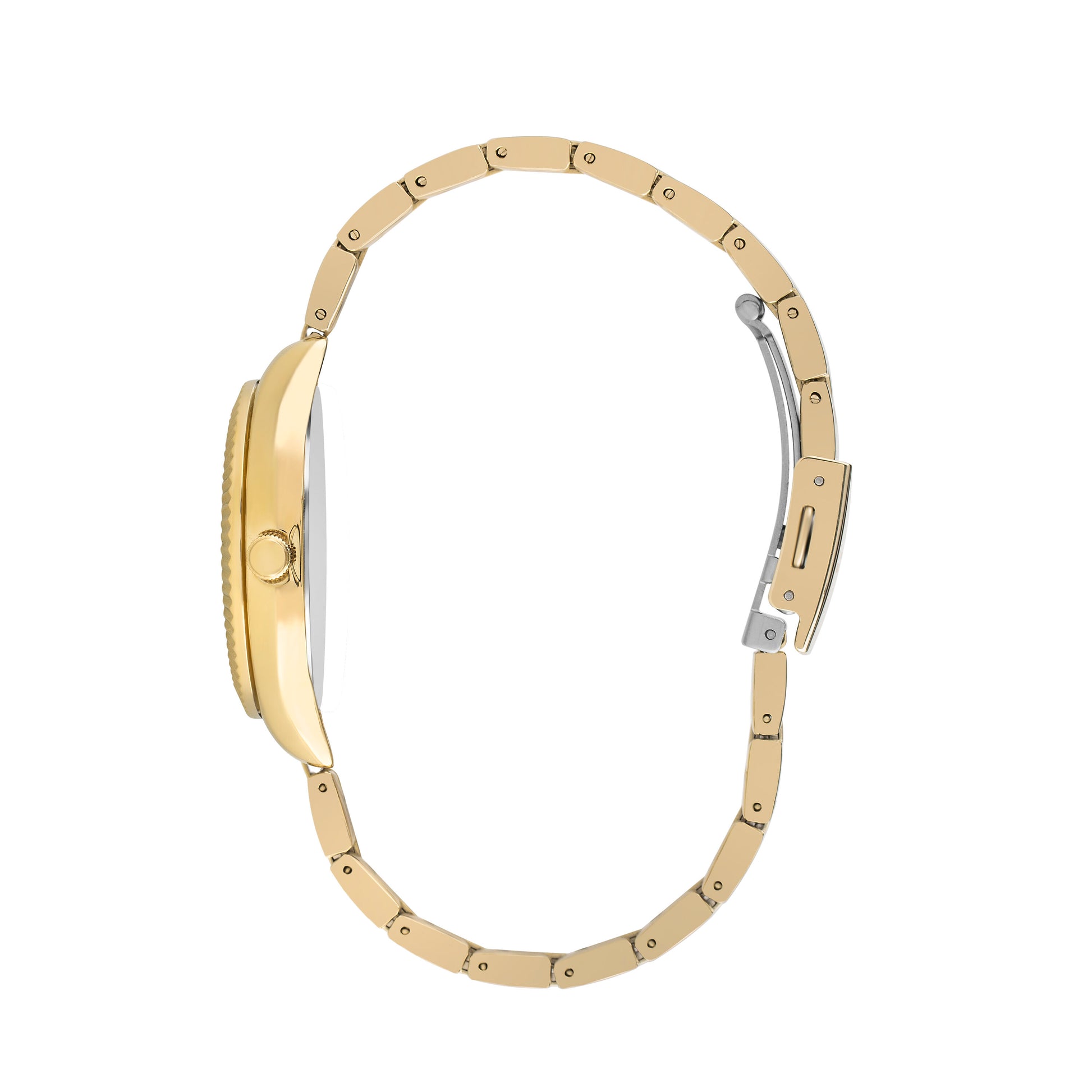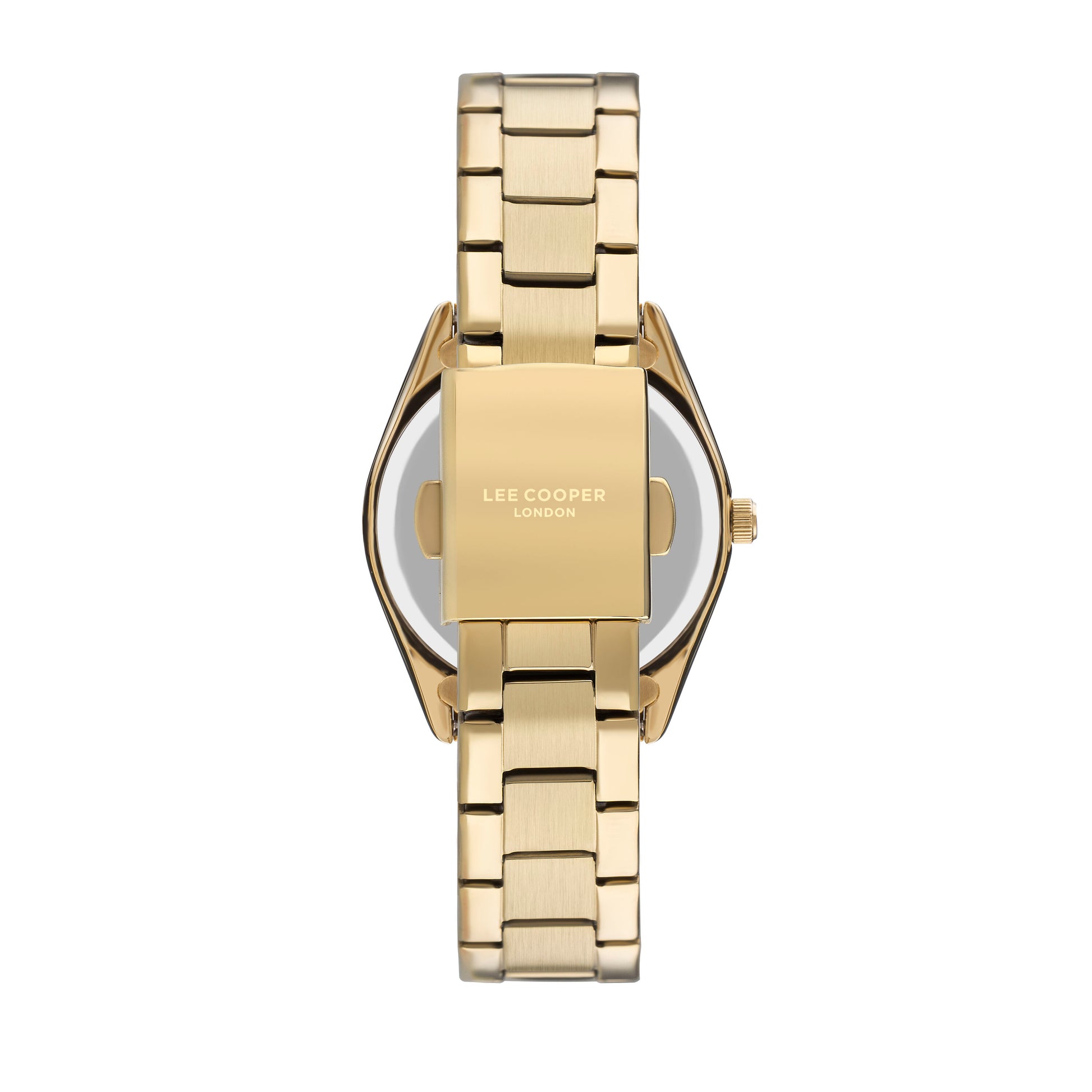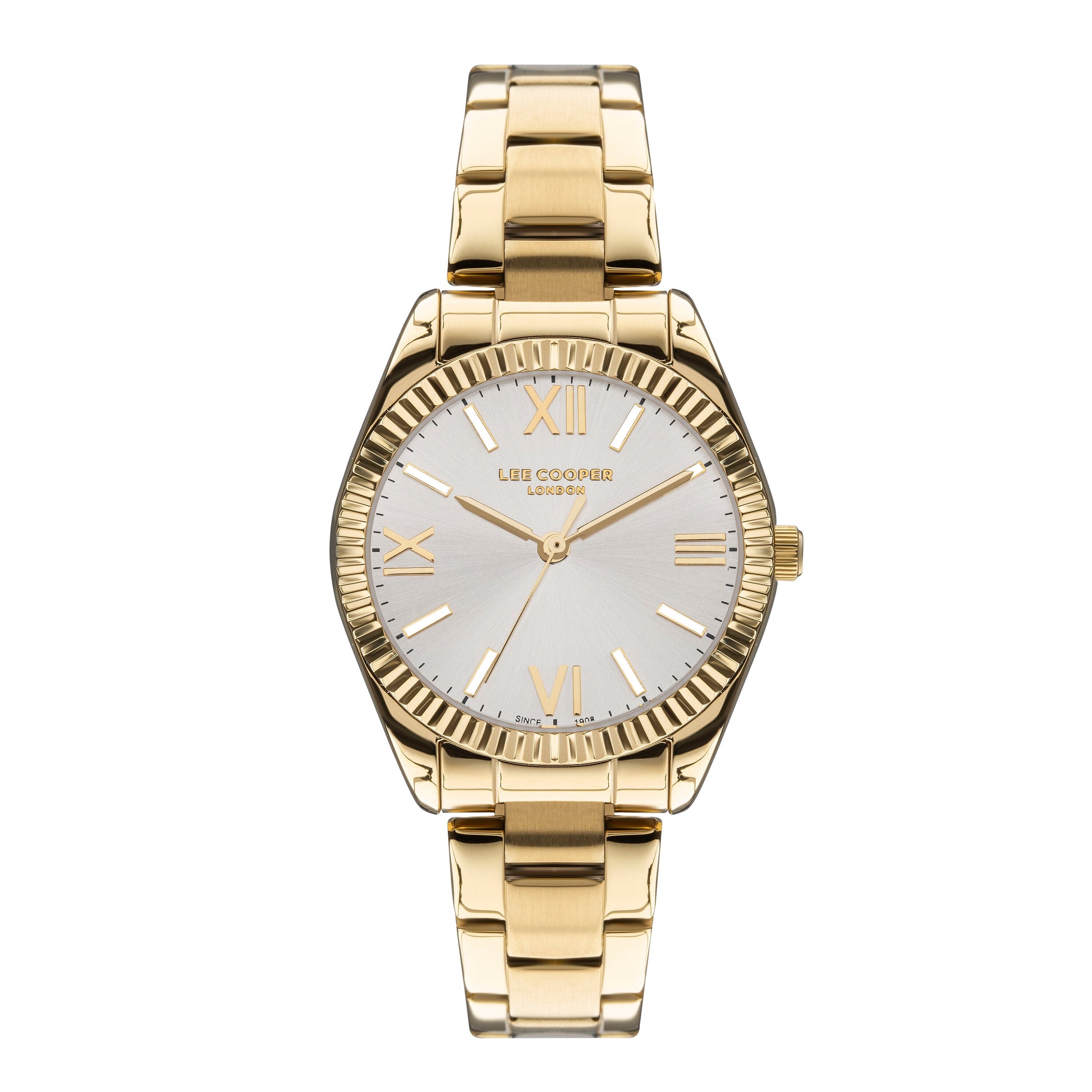 La montre Lee Cooper LC07459.130 est une montre analogique pour femme avec un cadran argenté et un fermoir à bouton-poussoir, doté d'un boîtier et d'un anneau supérieur en métal doré IP, ainsi que d'index et d'aiguilles des heures en or IP.